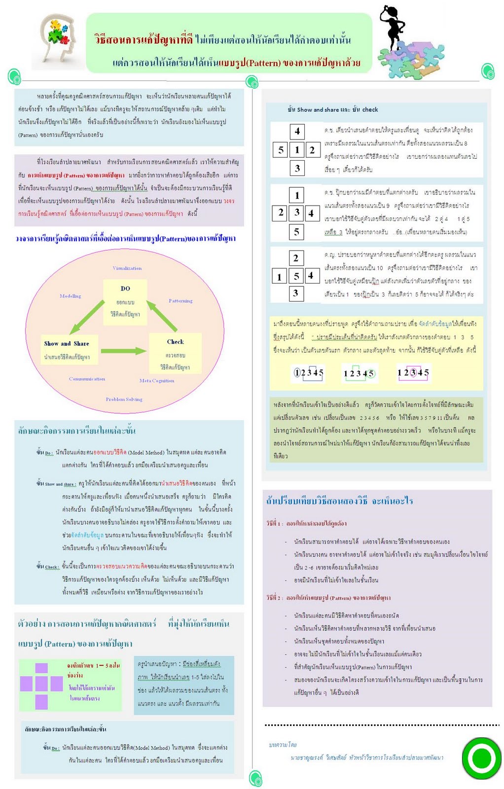 วิธีสอนการแก้ปัญหาที่ดี ไม่เพียงแต่สอนให้นักเรียนได้คำตอบเท่านั้น แต่ควรสอนให้นักเรียนได้เห็นแบบรูป(Pattern) ของการแก้ปัญหาด้วย